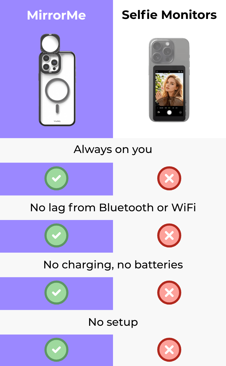 MirrorMe is built into your phone case—always with you, instantly ready, and requires no setup, charging, or attachments.